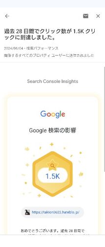 こんにちはタキオンです。 グーグルからメールが来てたんです。 こちら。 検索が28日間で15K達成! おっ。 ありがたや〜ありがたや〜。 まだまだ対した数字ではありませんがそれでも少し嬉しい(笑)。 15Kって 15奪三振ってことかな?(笑) グーグル先生も…